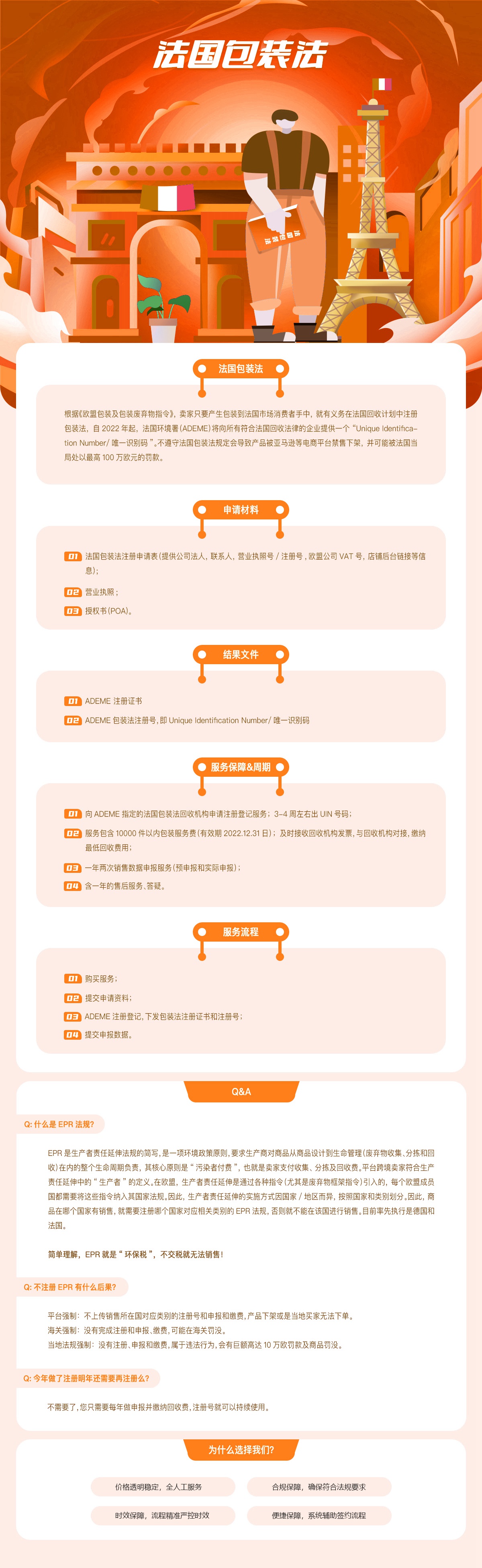 简介:法国包装法: 根据《欧盟包装及包装废弃物指令》,卖家只要产生包装到法国市场消费者手中,就有义务在法国回收计划中注册包装法,自2022年起,法国环境署(ADEME)将向所有符合法国回收法律的企业提供一个 “Unique...